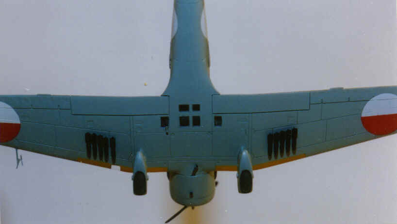 After all painting, decaling and flat coating, I painted in the navigation lights. The rear clear light is a touch of ModelMaster Chrome Silver with a drop of superglue on top. For the wing tip lights, I first masked and painted the lights ModelMaster Flat White. I then used Testor's Flat Red and the new ModelMaster RLM 24 Dunkelblau. What I do is give the bottles one quick shake to get some pigment up into the clear fluid carrier, which is of much thicker consistency than paint thinner. Brushing this very thin color on over the white gives a glossy brightened color that looks like a clear red or clear blue light cover (remember that Japanese aircraft used red and blue wing tip lights rather than red and green!).