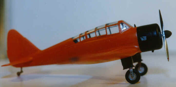 The Ki-55's were naturally colorful. Being trainers, they were finished in bright orange, with black or brown undercarriages and prop spinners, and a black cowling. Through my membership in the Small Air Forces Clearing House (a GREAT deal, by the way! If interested, please e-mail me for info), I recently came across a new decal company called Axis Decals, which had released a 1/72nd scale set of Manchukuo (Manchurian) Air Force markings for the Ki-27 Nate, and the Ki-36 and Ki-55, along with excellent color and marking placement instructions. The combination of the multi-colored national insignia and the trainer colors was my choice for my Ki-55. I used Model Master Flat Black for the cowling, Leather for the undercarriage legs, and Floquil Roof Brown for the spinner. The biggest difficulty came in selecting the trainer orange. There are MANY opinions on what shade this might have been, varying from a bright a red-orange to a dull yellow ochre. Whatever shade it was, it's apparent from old photos that it was bright. Using color chips published in Thorpe's Japanese Army Air Force Camoflage and Francillon's Japanese Aircraft of the Pacific War book, I matched their orange exactly with ModelMaster's new International Gloss Orange. It's a nice bright orange with just a hint of red in it. Even though it was a gloss, which I dread airbrushing, it went on beautifully and smoothly. The decals are excellent, but VERY thin (like Propagteam decals). Do NOT use SolvaSet, it's too strong and will destroy the decals! I used Microscale's MicrSol to set the decals. I used a very light brushing of orange pastel chalks to accentuate the panel lines.